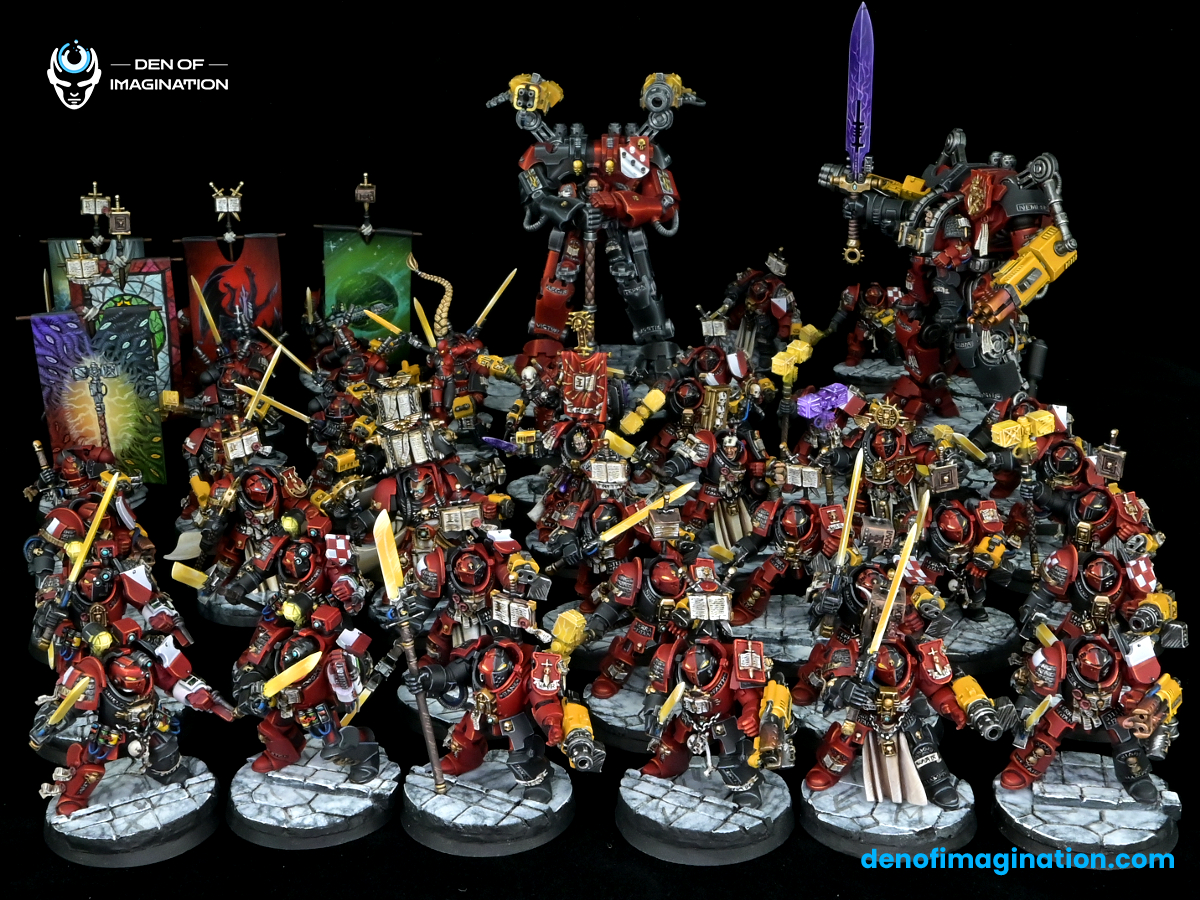The GMDK is stunning all around. The banners came out great, the golden throne is especially nice. cloak freehands, differing eye glow details and the kitbashed characters/ assassins all look incredible. I'm really happy with the techmarine who I thought would end up looking ridiculous with so much on the model but making the servo arm metal was a smart choice. The detail on the books, scrolling and the checkering of the armor I couldn't be more pleased with how everything came out!